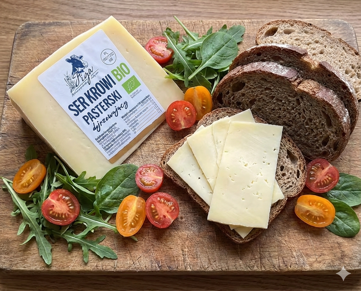 BIO Ser Pasterski Dojrzewający to połączenie ekologicznego mleka, czasu i rzemieślniczej pasji. Ser, który smakuje doskonale solo, ale też potrafi wynieść każde danie na wyższy poziom. Idealny wybór dla tych, którzy w kuchni stawiają na jakość, autentyczność i głęboki smak.