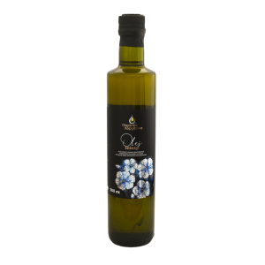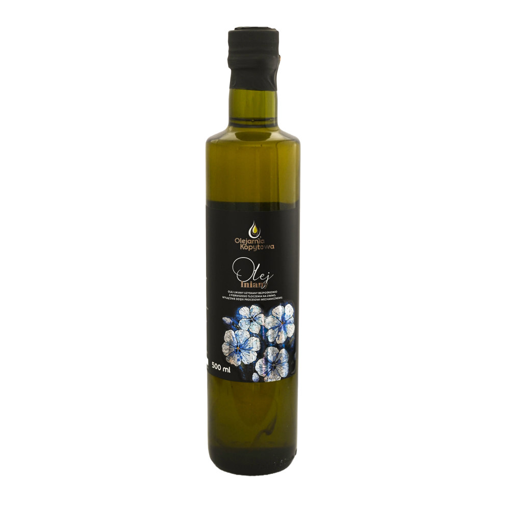 Olej lniany tłoczony na zimno, niefiltrowany.