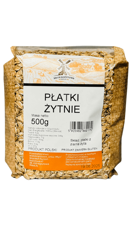 Płatki żytnie powstają z pełnych, mechanicznie rozdrobnionych ziaren żyta, dzięki czemu zachowują wszystkie naturalne składniki odżywcze, z których to zboże słynie od wieków.